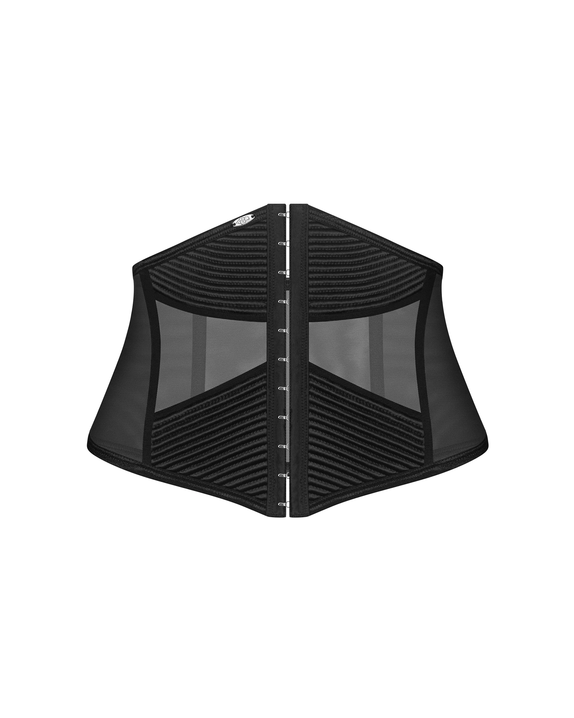 Corset made from recycled fabrics with a decorative texture. Vertical boning visually shapes the silhouette, while the carefully contoured design highlights the waist and ensures comfortable wear.