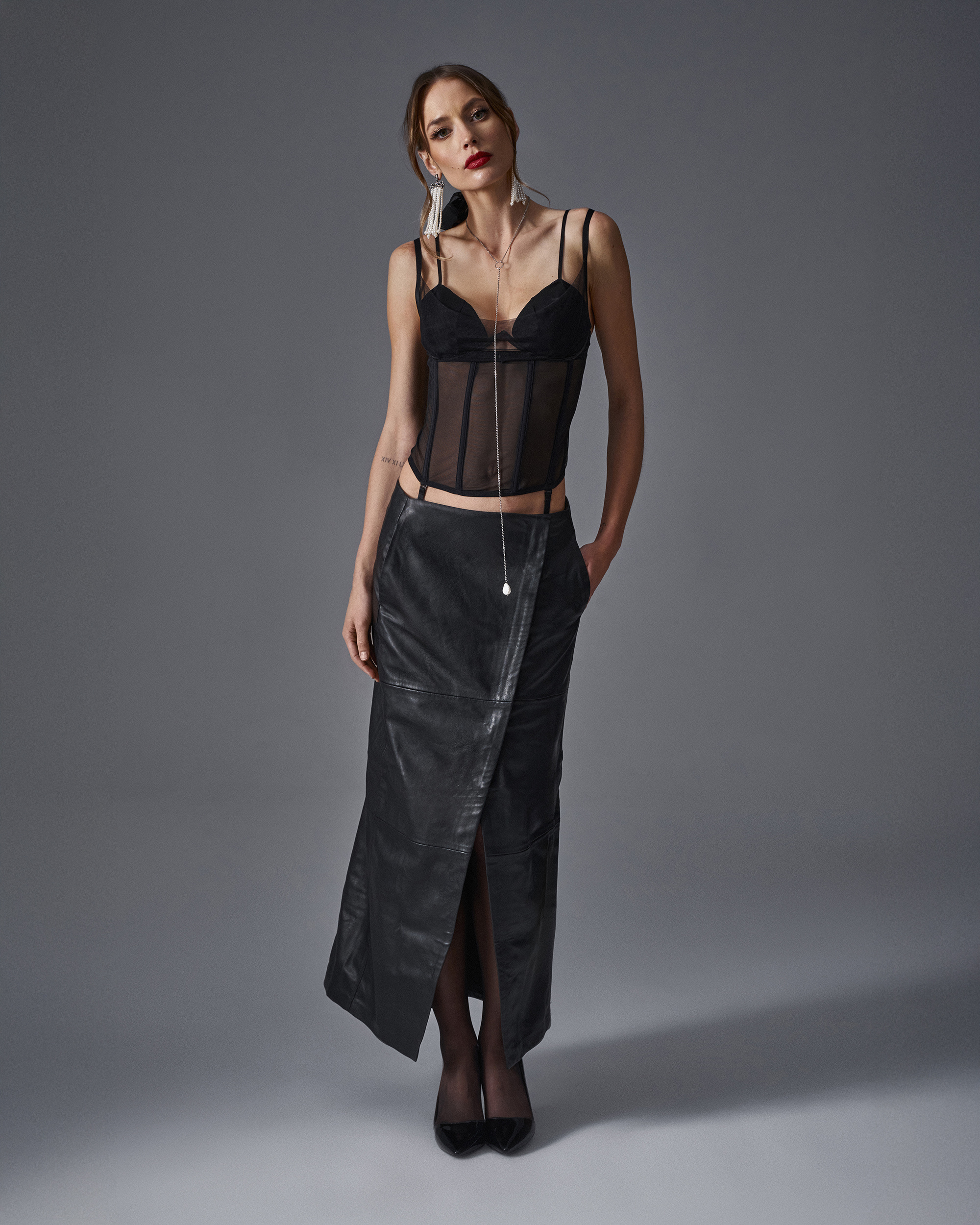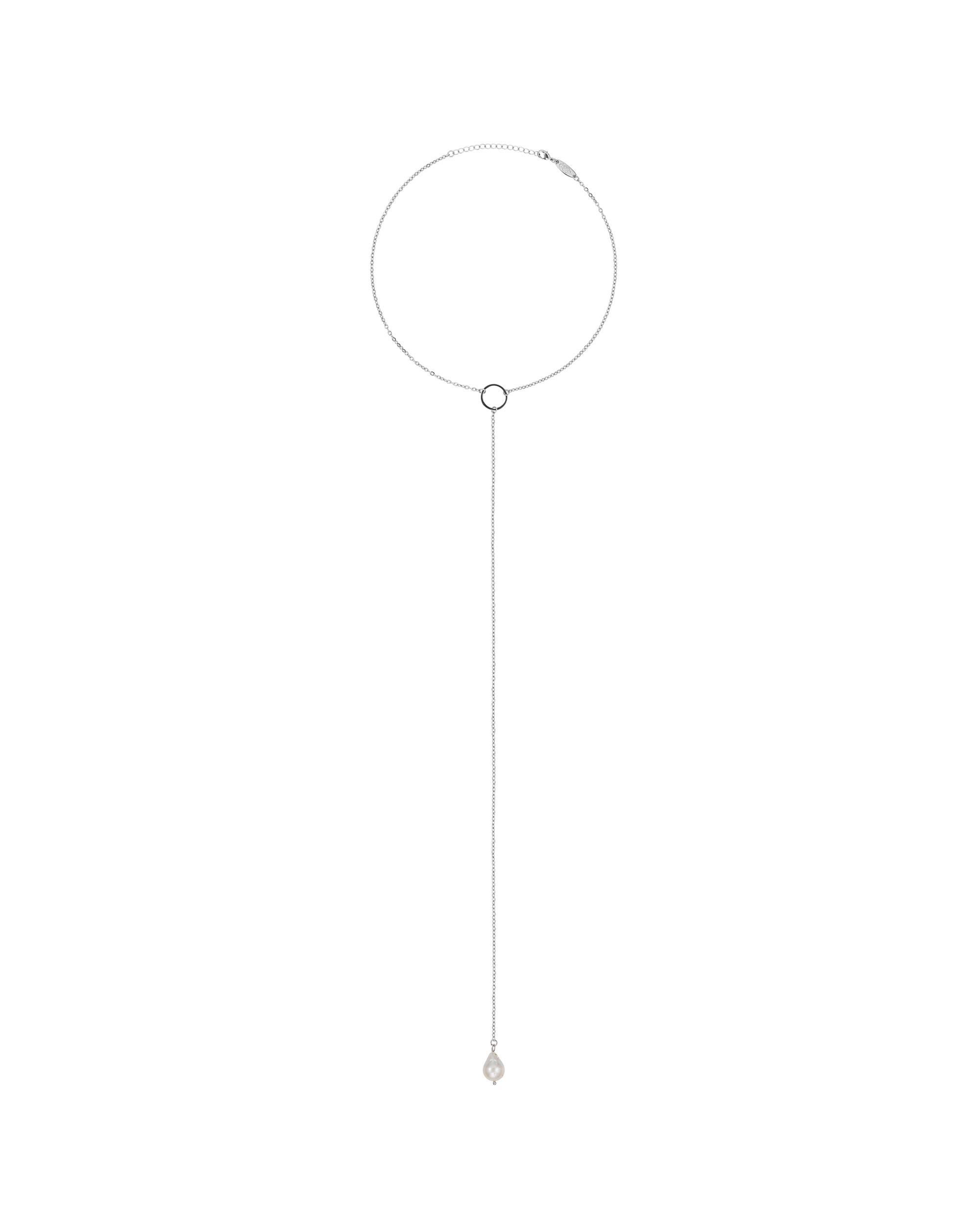 A delicate silver chain with beautiful details. This minimalist jewelry design subtly highlights the neckline, adding a luxurious touch to your outfits. A long chain starts from a round connector at the neck and ends with a natural freshwater pearl. The necklace is adjustable and nickel-free – perfect for sensitive skin.